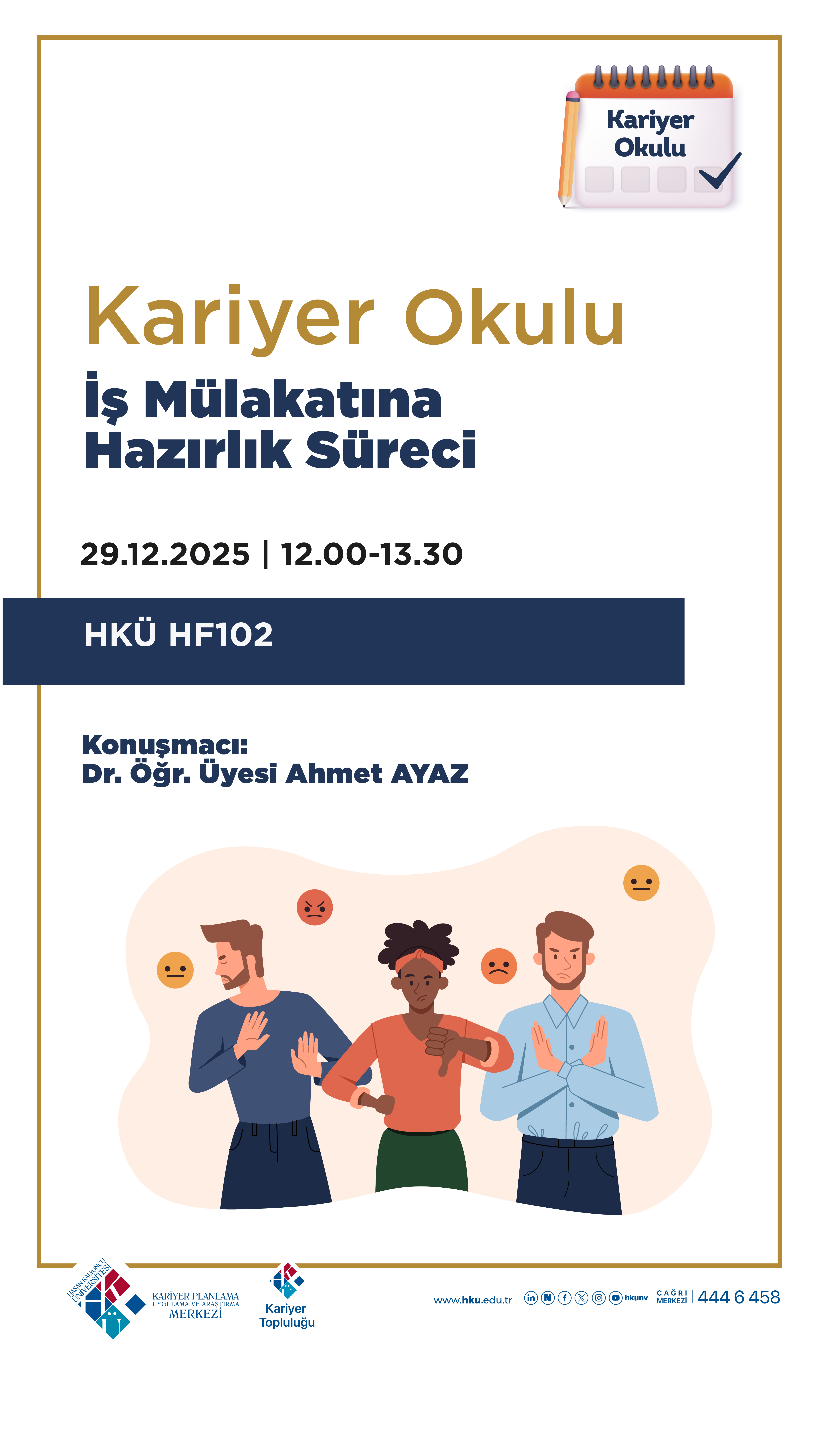 Kariyer Okulu – İş Mülakatına Hazırlık Süreci 18/12/2025İş İlanları Kariyer Okulu kapsamında Dr. Öğr. Üyesi Ahmet AYAZ tarafından İş Mülakatına Hazırlık Süreci atölyesi gerçekleştirilecektir. Yer: HKÜ HF102 Tarih: 29.12.2025 – 12:00 Facebook Twitter Google Plus LinkedIn
